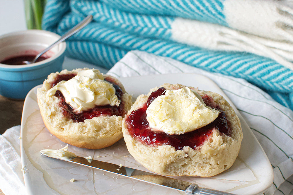 Classic Baker Tom Afternoon Cream Tea. The plain scone, strawberry jam, real Cornish clotted cream and Cornish tea.